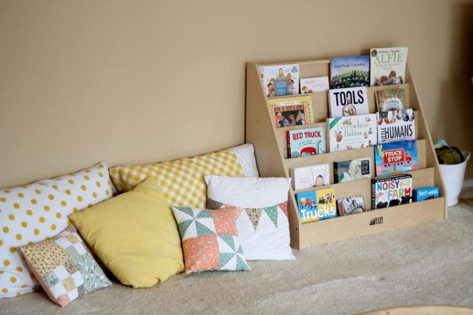 Kareniny děti si dříve vytahovaly své pestré knihy z plných polic a nechávaly je pak často ležet všude po domě. Simone do jednoho rohu místnosti umístila na zem složenou teplou deku, několik polštářů a oblíbených plyšáků. Ke Karenině překvapení vyndala knihy z otevřených polic a umístila je do uzavíratelné komody – nejníže knížky pro batole, nejvýše pro školáka. Jen pár knih pak narovnala do proutěných košů. V otevřených policích bývalé knihovny našly místo pokojové květiny, jejichž zalévání se stalo novou povinností starších dětí („Zatím je to baví, uvidíme, jak dlouho jim to vydrží,“ dodává Karen po několika týdnech od proměny).