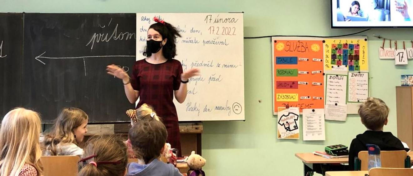 Je pátek, druhá hodina, ve 3.B začíná prvouka. Dnešní téma: současnost, minulost a budoucnost. Ale také present, past and future, protože v téhle hodině se bude mluvit i anglicky. „Co je to?“ ptá se učitelka Kristýna a kreslí na tabuli čáru, která začíná slovem minulost a končí slovem budoucnost. Děti se hlásí a správně odpovídají, že jde o časovou osu. „Do you know, how to say it in English?“ vstupuje poprvé do hovoru anglická lektorka Emily. Třeťáci odpovídají, u slova present (současnost) se někteří zarazí. „Máte pravdu, to slovo má dva významy, může to být i dárek,“ vysvětluje anglicky Emily. Na obrazovce nad její hlavou svítí anglická slova PAST – PRESENT – FUTURE, aby se během hodiny dostala pod kůži i těm, kteří je ještě neznali.