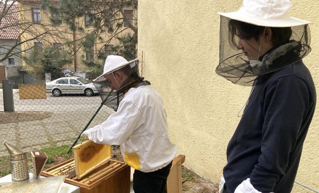 Je slunečné jarní poledne, včelky jsou pravděpodobně venku a pracují, což je ideální čas na otevření úlu. Z budovy školy je to k nim na zahradu jen pár kroků. Napřed kluci chvíli pozorují dění kolem a sledují, jak včelky postupně lítají ven a zase zpátky do úlu. „Teď třeba úplně krásně vidíme, jak mají na třetím páru nožiček takové to oranžové, tak to je pyl,“ popisuje student Honza. Takhle si sem občas vezmou na prohlídku i některé další spolužáky z jiných tříd. Ti díky tomu poznávají život včel daleko detailněji než jen z učebnic.
