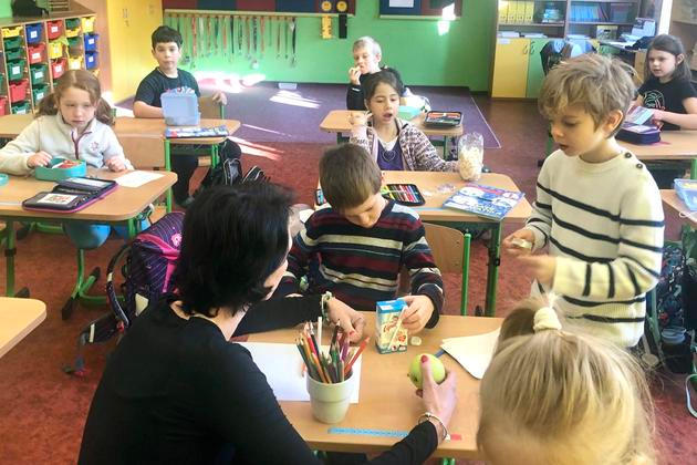 Je přestávka, děti vytahují svačiny. Kosťa žádnou nemá, přišel dnes úplně nalehko. Asistentka běží pro pití v krabičce a jablko, které škola dostává v rámci akce „mléko a ovoce do škol“. „Moloko, jabluko,“ říká Kosťa a všichni opakují.
