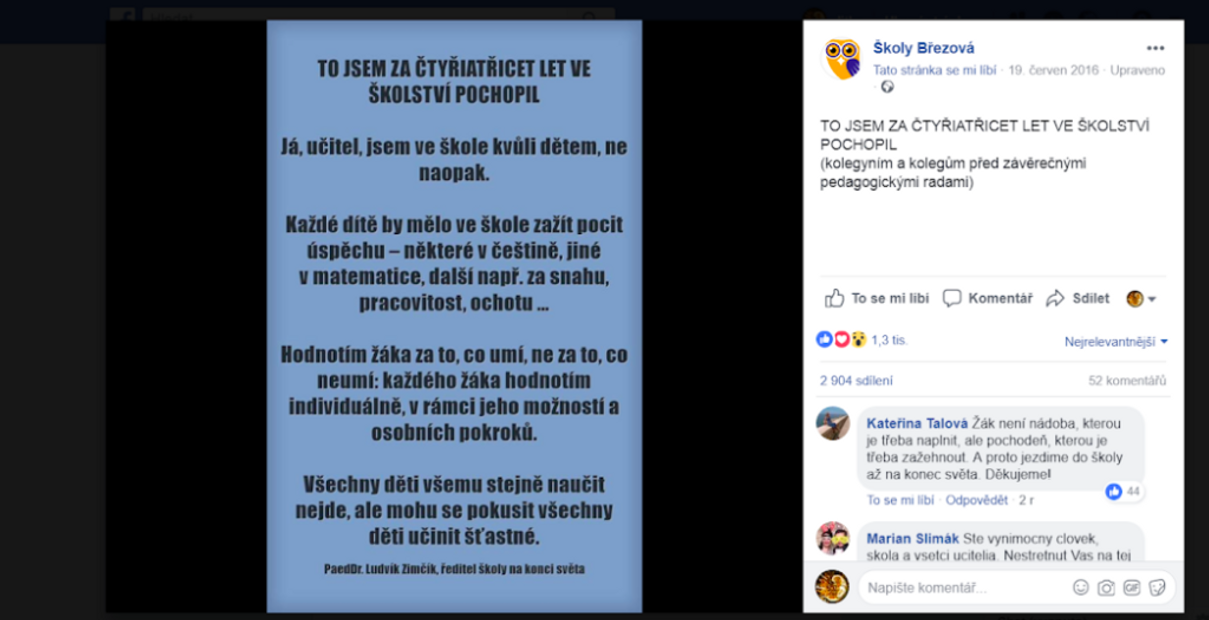 Víte, učit chytré děti umí každý. Rozvíjet chytré dítě, které navíc rodiče podporují, není zdaleka takové umění jako posunout žáka, který má problémy se čtením nebo pomaleji chápe. I takové dítě lze přitom ocenit za snahu, pracovitost, ochotu… Každý by měl ve škole zažít pocit úspěchu.