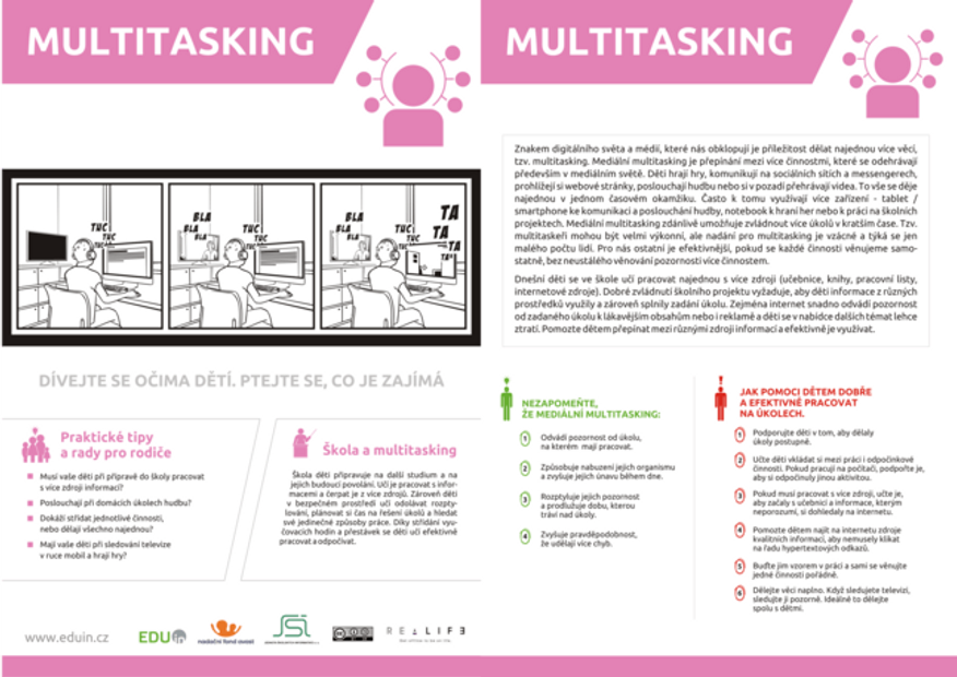 Dnešní děti vyrůstají ve světě, který k multitaskingu přímo vybízí. Musejí pracovat s mnoha nejrůznějšími zdroji informací – s učebnicemi, knihami, pracovními listy, internetovými zdroji. Zejména na internetu se ale děti musejí prokousávat reklamou a často se hypertextovými zdroji proklikají někam, kde se nic relevantního nedozvědí.