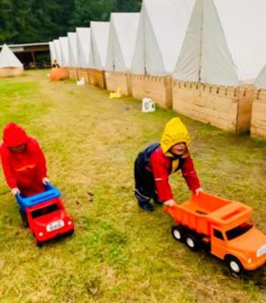 I tak se pořád něco děje a tábor žije. Dvouletí kluci vozí z lesa do kuchyně dříví na tatrovce, holčičky sbírají z cestičky k latríně šišky, aby je nepíchaly do nožiček, když chodí bosy. Jiná parta staví s jedním tatínkem bunkr nebo přehradu na potoce, navzájem se vozí ve dvoukoláku nebo zjišťují, jaká je to sranda, převrátit kolečko a točit jeho kolečky. Bahní se, pinoží po louce, ti nejmenší si nehrají ani moc spolu, spíš vedle sebe. Ale je možno vidět i pětileté au-pairky, jak se starají o roční děti. Večer – ještě ani není tma – si nasadí čelovky, a jsou šťastní, protože vědí, že jejich starší brácha je tou dobou na skautském táboře a taky má čelovku.