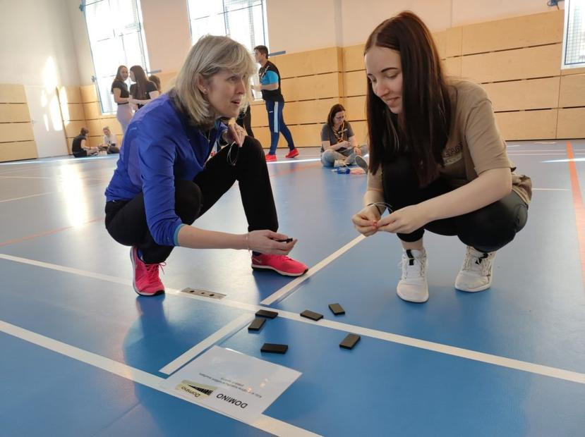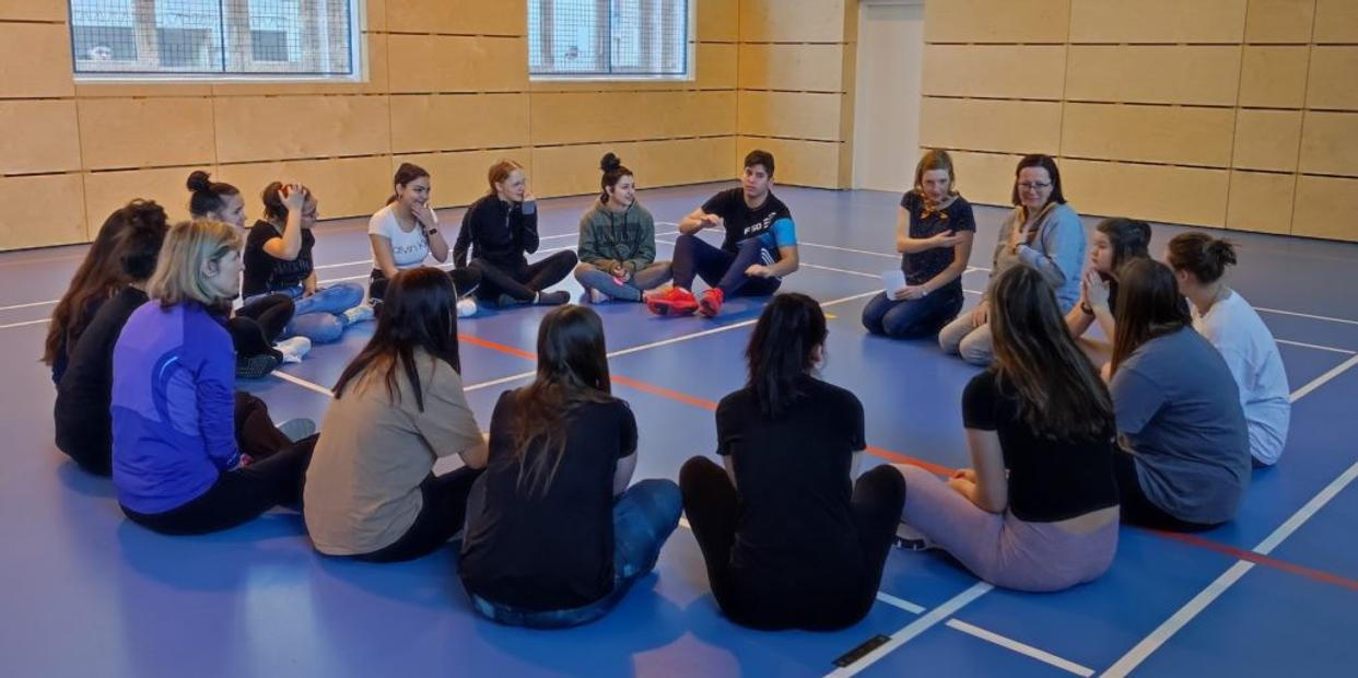 Když jsou jména napsaná a ospalá atmosféra se trochu zvedá, přicházejí lektorky s hrou „na laser“ – procházejí tělocvičnou s napjatým lanem a studenti ho mají překonávat tak, aby je „laserový paprsek“ nespálil. „Já nejsem sportovní typ,“ protestuje hnědovlasá Bára, ale už za chvíli se nechává strhnout a překonává lano pomocí volejbalových rybiček a ukázkových parakotoulů. Po jejím boku skáče i pedagožka Jindřiška, mimo jiné učitelka tělocviku, a po každém kole jí studentky uhlazují rozcuchané plavé vlasy. „Je super, že se paní učitelka zapojuje, pak má program úplně jinou dynamiku, než když tam jen stojí a pozoruje,“ podotýká lektorka Tereza s úsměvem. Přichází čas na další pohybové hry, to už si učitelka sedá stranou a pozoruje, jak se její třídě rozdělené na dva týmy daří spolupráce.