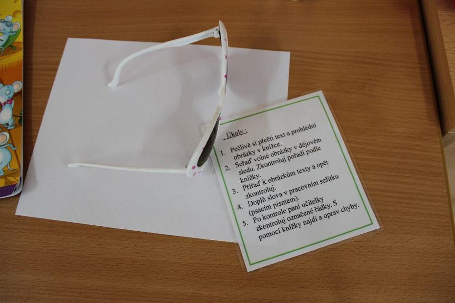 Dole na stolku je přilepený seznam úloh. Když dítě úlohu dokončí, udělá křížek u svého jména a může si vzít další. To každému umožňuje pracovat svým tempem. Někteří z prvňáčků tak již pracují na úkolech z druhé třídy.