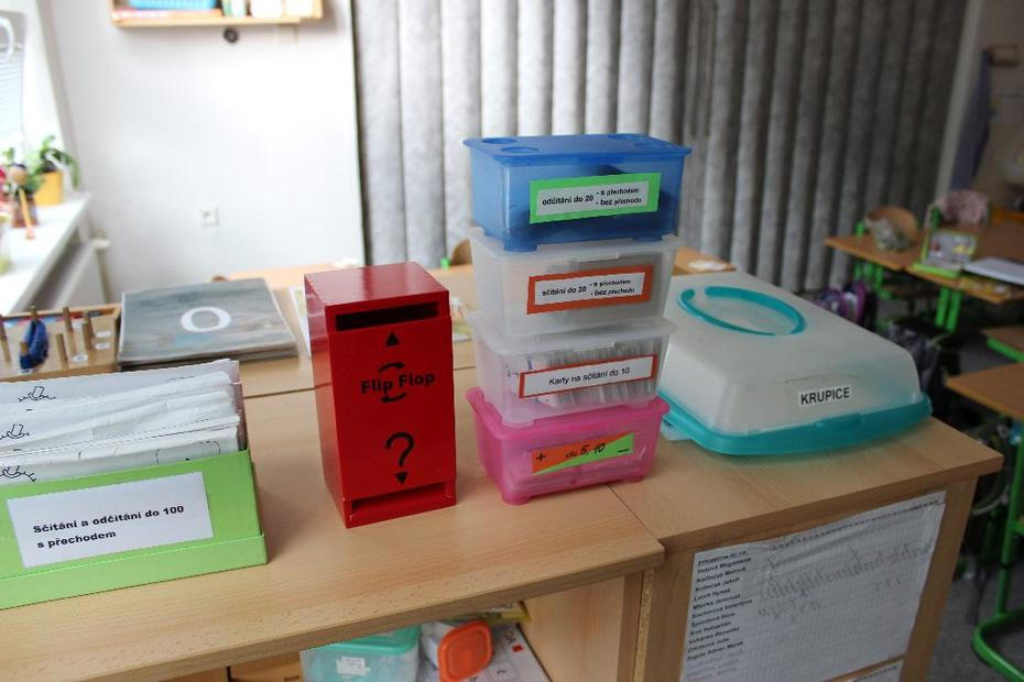 Po celé třídě potkáváte krabičky – učební pomůcky. Každá obsahuje nějakou úlohu, kterou má žák zpracovat. Někdo dělá matiku, někdo češtinu. Je běžné, že děti dělají souběžně různé věci.