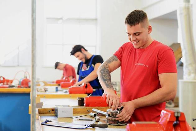 Moderní přístroje a učební pomůcky mají od partnerů k dispozici i na detašovaném pracovišti, kde se nachází dílny budoucích instalatérů, automechaniků a karosářů. U instalatérů se právě kluci v červených montérkách snaží pracovat s ocelovými trubkami. Hnědovlasý učeň s náušnicí v uchu piluje a po chvíli se mu tvář křiví námahou a bolestí a z čela odkapává pot. „Samozřejmě dnes už je hodně instalací v mědi nebo plastu a není to tak náročné, ale i s ocelí se to musí umět. A ne každý na to fyzicky má,“ upozorňuje zástupce ředitelky pro praktické vyučování Pavel Zima. Škola mimochodem podporuje učně v tom, aby chodili na praxi do firem. Stává se ale, že po pár měsících přijdou a chtějí se vrátit do školních dílen. „Když takový šestnáctiletý kluk chodí po zakázkách s dvěma padesátníky, tak se mu brzy začne stýskat,“ usmívá se Pavel Zima. „Tak ho samozřejmě vezmeme zase zpátky.“