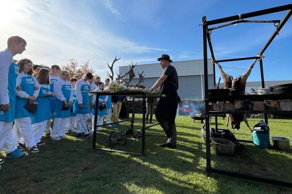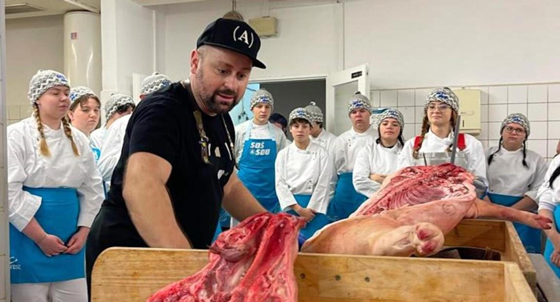 O pár metrů dál v cvičné kuchyni se síťkami na hlavě pracují mladší spolužáci Rozálie a Adama, kteří se teprve pomalu učí úplné základy. Jedna skupinka se například snaží vylovit z velkého hrnce kus brambory a zjistit, jestli už je lze považovat za uvařené. „Nemusí být úplně doměkka, ještě je budeme opékat, takže se dodělají,“ upozorňuje je potetovaný chlapík s bradkou, mistr odborného výcviku Jaroslav Ekrt. Dnes pro pedagogický sbor vaří vepřovou panenku s opečenými bramborami a barbecue omáčkou. „Pracoval jsem v restauracích, ale pak mi začalo dávat větší smysl podělit se o to, co umím. Navíc sem od partnerů dostáváme opravdu moderní technologie, s jakými bych se v běžné praxi možná nesetkal,“ říká a suverénně se pohybuje mezi nerezovými přístroji.