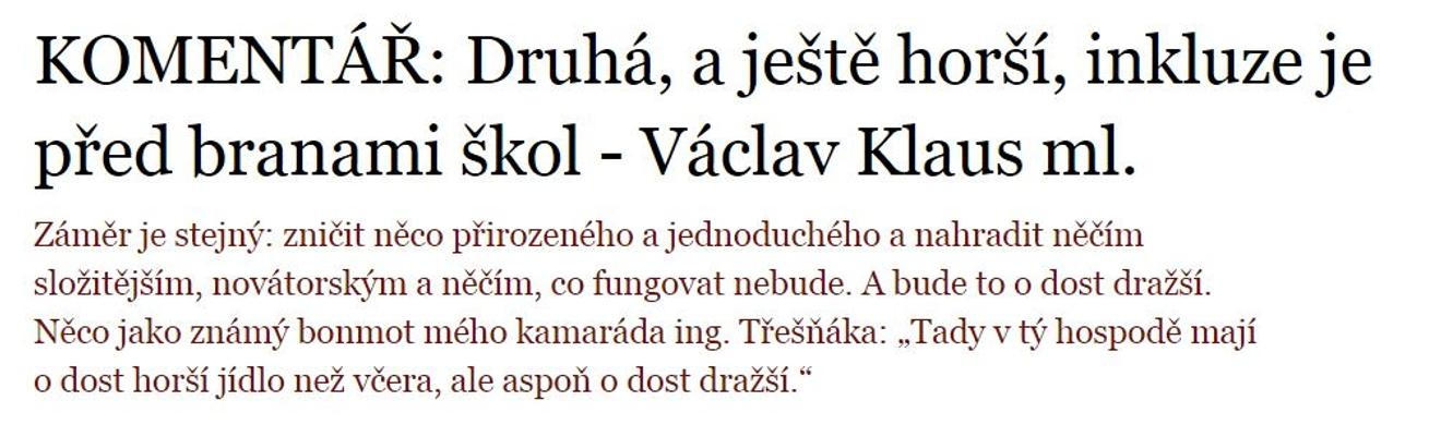 Nelze přehlédnout ani podivné tematické rozpolcení komentáře. Nepochopitelný je již titulek: Druhá, a ještě horší, inkluze je před branami škol. Klaus se zde vyjadřuje k reformě financování škol, ale v titulku a v kusu komentáře se najednou extempore pojednává inkluze, která taky není také nic jiného než – rozvrat, jak jinak. Když tedy toto vedlejší téma nebudeme brát jen jako lapač na čtenáře, ale jakože tam nějak patří, i tady chybí jakékoli argumenty. Tematická zpráva České školní inspekce uvádí kromě negativ také mnoho přínosů společného vzdělávání neboli inkluze. Jasně, dá se o tom diskutovat, ale tohle je jen víření kalné vody.