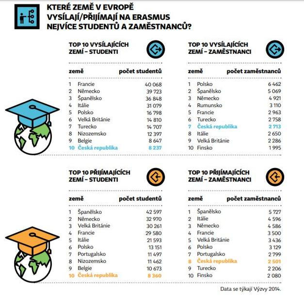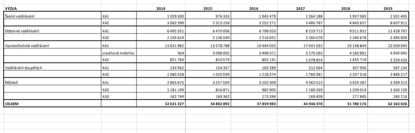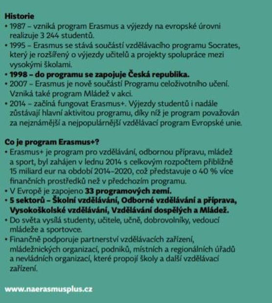 ¤ Od svého vzniku v roce 1987 do roku 2015 podpořil Erasmus 9 milionů osob: přes 5 milionů tvořili studenti, učni a dobrovolníci, dále šlo o výměny zaměstnanců a mládeže.¤ Erasmus+ existuje od roku 2014. Je určen všem úrovním formálního i neformálního vzdělávání včetně sportu. V období 2014-2020 disponuje rozpočtem ve výši 14,7 miliardy eur a zahrne více než čtyři miliony osob.¤ Na rok 2019 získala Česká republika celkovou částku 62 163 026 eur, což je oproti loňskému roku navýšení o 20 procent.¤ V rámci programů pro základní a střední školy vycestovalo od roku 2014 více než 5000 žáků a studentů MŠ, ZŠ, SŠ (více než 2500 ze středních škol). Většina na krátkodobý pobyt v rozmezí 3 dnů až 2 měsíců. Nejčastěji se vyjíždí na týden.zdroj: Evropská komise a Dům zahraniční spolupráce