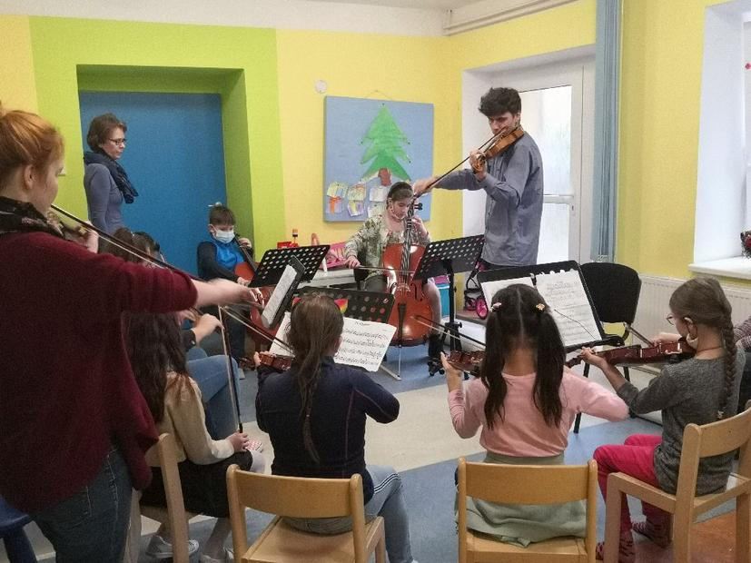 Schyluje se k poledni, „áčka“ už několikrát zahrála pro kameramana skladbu Allegretto, titulní píseň z filmu Piráti z Karibiku i Chtíc, aby spal. Na lektorech je ale vidět, že ještě stále nejsou spokojeni. „Je jasné, že jsme se dlouho neviděli, proto nejsme sehraní. Je ale potřeba, abyste se navzájem víc poslouchali,“ vysvětluje houslista Zdeněk. Aby si děti chvíli odpočinuly, vytvoří lektoři improvizované trio a hrají koledu sami. Děti sedí, ani nedutají, a bez hnutí naslouchají písni o mateřské lásce a naději.