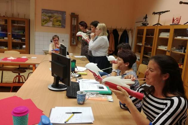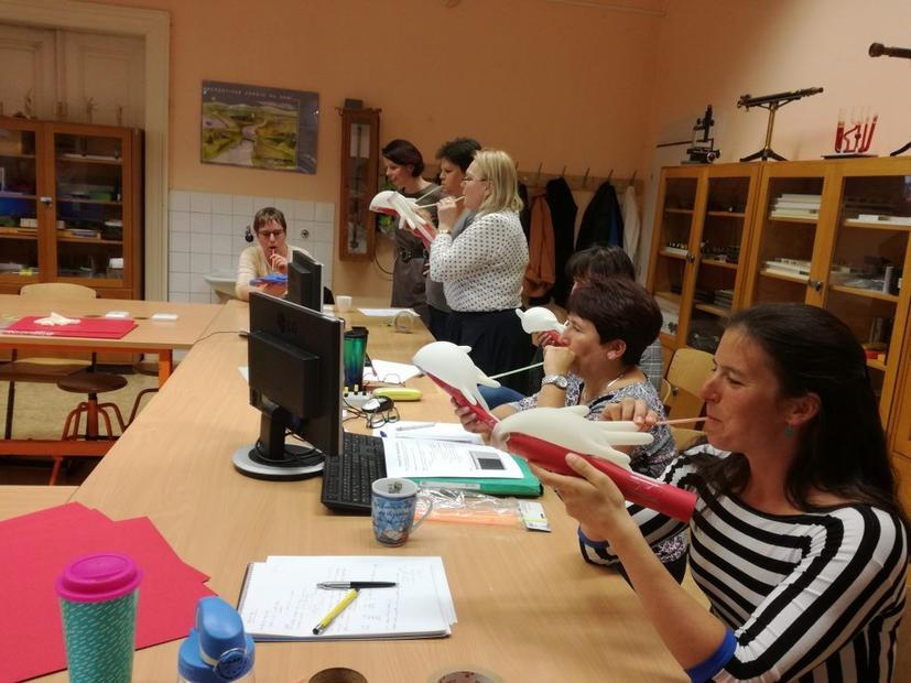Přednáška pomalu končí. Libor Husník ještě pouští slibované zvukové ukázky a učitelé tipují, ve které zazněla oktáva a v jaký moment jim jejich ucho ze střídání tónu a šumu vytvořilo jeden spojitý tón. Poté už Věra posílá mezi účastníky červené čtvrtky, gumové rukavice, plastová brčka, lepicí pásku a nůžky, a vysvětluje, jak vyrobit jednoduché dudy.