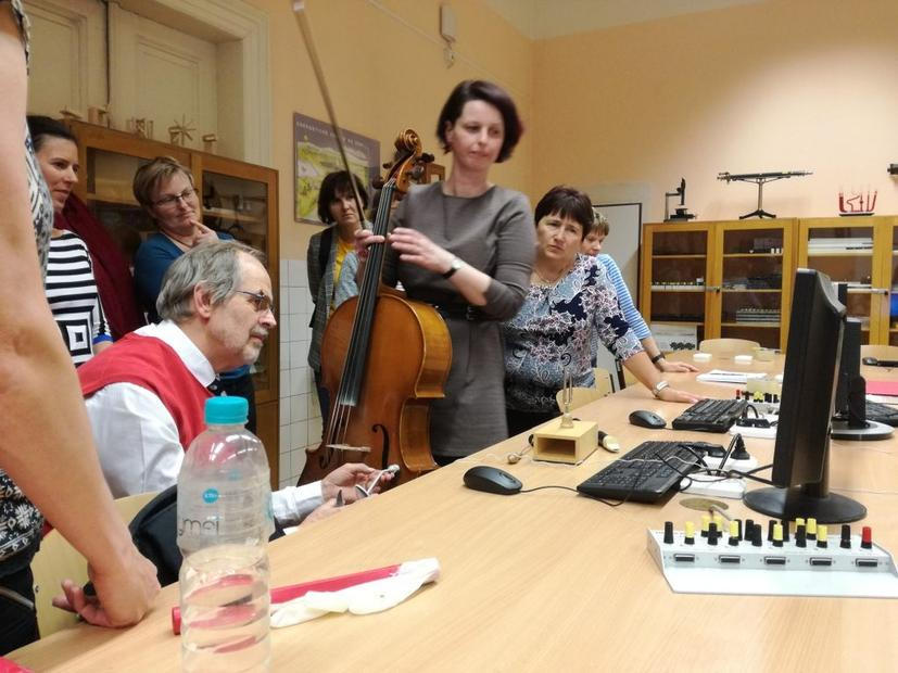 „Tady vidíte program, který je zdarma a můžete ho klidně využít v hodině bez dalších nákladů. Potřebujete jen mikrofon,“ vysvětluje Věra, zatímco se učitelé shromažďují kolem ní. S ladičkou, flétnou a violoncellem, které je kromě fyziky jejím koníčkem, postupně ukazuje, jak se tón v počítači mění na graf. „Já z těch grafů dělám printscreeny, aby si to studenti mohli vytisknout, nalepit a prozkoumat, jak se liší tóny z jednotlivých nástrojů,“ říká. „To bych mohla děti vyzvat, aby si přinesly nástroje, na které hrají,“ poznamenává jedna z učitelek.