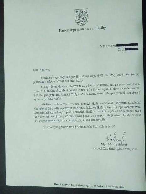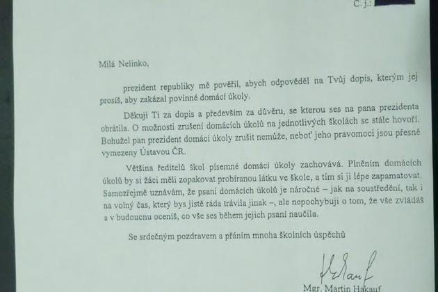 Uplynulo pár dní a dorazila sousedka. V ruce dopis pro „váženou slečnu Nelinku“ s odesílací adresou: Hrad I. Nádvoří čp. 1, Hradčany, 119 08 Praha 1, a trochu nabroušeně se ptala: „Prý jste navedl Nelču a Magdu, aby napsaly prezidentovi, že nebudou psát úkoly?“ Zavolal jsem Magdu: „Kde jste vzaly adresu?“ Magda odpověděla: „Kolik máme prezidentů? Kde bydlí? Prostě pan prezident, Praha, Pražský hrad 1.“ Samozřejmost jejích úvah mě uzemňovala: „Jistě, jistě. A ten dopis, co jste mu poslaly, ten máte taky?“ Místo holek odpověděla sousedka: „Jo, ten si okopírovaly! Tady je!“
