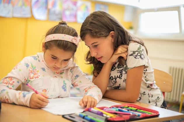 „S Buddies programem mám zkušenosti, nedělám to poprvé. Baví mě na tom všechno, jak to čteme a střídáme se. Přes počítač to bylo taky dobrý, ale naživo je to lepší,“ srovnává online a offline podobu programu Valča (na snímku vpravo s Johankou z druhé třídy)Foto: Kateřina Lánská