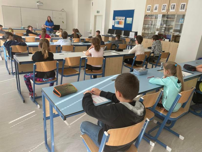 „Já nemám tužku!“ hlásí se chlapec v první řadě a ze židlí hned vyskakují tři jeho kamarádi, aby mu ji půjčili. „Umíte všichni napsat číslice jedna, dva, tři, čtyři, pět a šest?“ ptá se Lucie Měchurová. Když všichni přisvědčí, začne vysvětlovat, co mají dělat. Otáčejí na první stranu knížky a odhadují, který obrázek mají doplnit do předtištěné řady. Na výběr mají ze šesti obrazců. „Ukažte na něj prstem,“ říká Lucie Měchurová a obchází všechny děti. Pak jim vysvětluje, kam se výsledek zapíše. Pak zkontroluje také druhý příklad, jestli všichni pochopili, a pak už se jede na ostro. Všichni musejí v tu chvíli pozorně poslouchat, na test se totiž nedá připravit, protože jeho zadání je tajné.