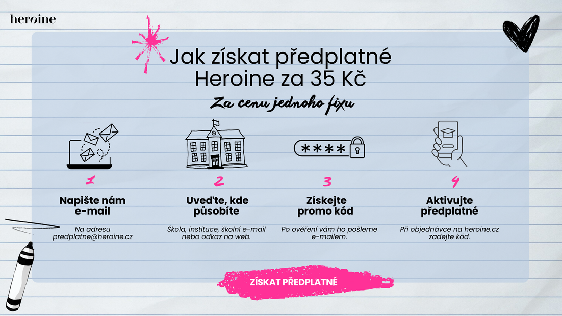 Jste pedagožka, školní psycholog, asistentka pedagoga nebo studujete pedagogiku? Magazín Heroine vám jako poděkování nabízí speciální webové předplatné za 35 Kč měsíčně – tedy přibližně tolik, kolik stojí jeden fix. Navazujeme na odkaz EDUzínu a přinášíme kvalitní, nezávislou žurnalistiku o vzdělávání. Získejte neomezený přístup ke všem článkům na webu – nejen o vzdělávání, ale i o společnosti, duševním zdraví a lidskoprávním světě v celé jeho rozmanitosti.
