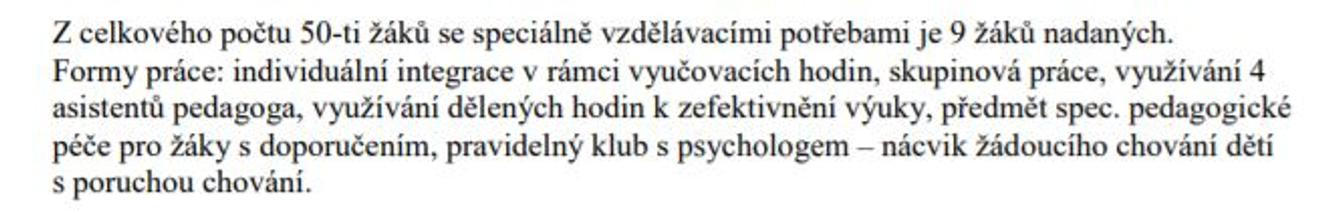 V převážné většině hodin tyto děti pracují na základě individuálního vzdělávacího plánu ve svých třídách. Část hodin jsou ale mimo základní kolektivy svých tříd a probírají látku více do hloubky. Speciální hodiny se týkají českého jazyka, matematiky, někdy i prvouky, vlastivědy, přírodovědy a angličtiny. Do výuky také zařazujeme netradiční metody a využíváme možnosti opatřit takovým žákům speciální učební pomůcky. Škola se opírá o odborné konzultace Centra nadání vedeného manželi Fořtíkovými, ale výbornou spolupráci máme i s pedagogicko-psychologickou poradnou. Od roku 2017 máme Školské poradenské pracoviště, tvořené psycholožkou a speciální pedagožkou, se kterým učitelé problematiku konzultují.