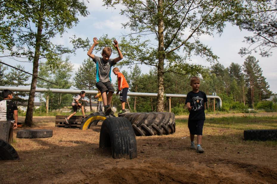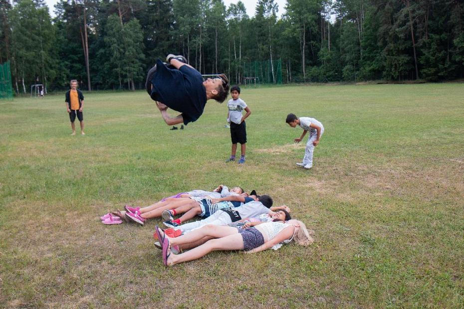 Pak mě děti táhnou po okolí a ukazují mi svá oblíbená místa. Poprvé vidím parkourové hřiště, které vytvořili. Kluci učí jednu holku udělat salto vzad.