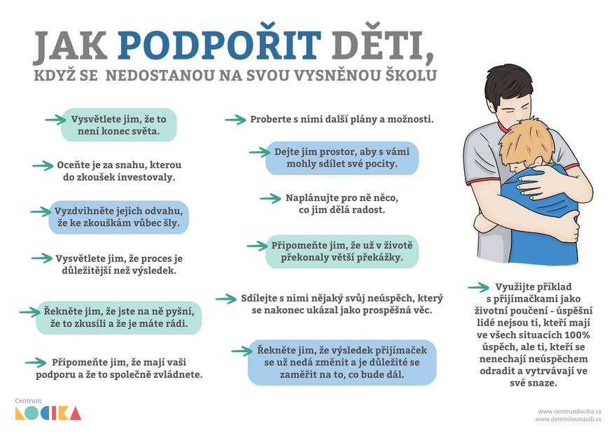 Naopak radí, aby se rodiče pokusili význam přijímacího řízení nepřeceňovat. Například tím, že si připraví i plán B. Promluví si se svými dětmi o tom, jaké další řešení a cesty mají, pokud vše nedopadne podle plánu. A dětem zdůrazní, že hlavní je snaha, ne výsledek.
