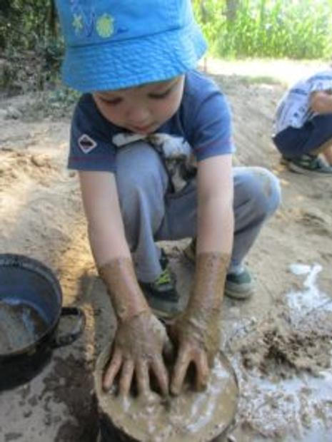 Voda. Hrát si s vodou a s blátem. Některé děti se do toho ponoří tak, že jsou až po hlavu zablácené. Když jsme měli téma Cesta do pravěku, tak jsme si vyprávěli, jak se asi v té době žilo. A děti si pak úplně spontánně založily na kraji pole pravěkou hliněnou dílnu. Část dětí nosila dešťovou vodu z barelu, přisypávala hlínu, střídaly se v míchání. Z bláta si vyráběly misky, hrnečky… Bylo úžasné sledovat, jak si bez našich zásahů a pomoci dokážou poradit. Jak si ve své volné hře našly význam a byly schopné hodinu sedět a plácat z bláta kuličky, které si pak sušily na slunci.
