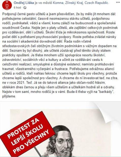 Proč šli včera mnozí učitelé do školy v černém oblečení a někteří i v černých brýlích? Symbolicky vyjádřili smutek ze špatných podmínek pro svou práci i odhodlání se za zlepšení aktivně postavit. "Kolem akce ´Vidíme to černě´ se strhla pěkná mediální mela," napsala na Facebook Petra Mazancová, předsedkyně spolku Učitelská platforma, která protest pod tímto hashtagem iniciovala. "UP kontaktuje enormní množství zástupců médií, chtějí mluvit s učiteli. MÁ TO SMYSL, NÁŠ HLAS MŮŽE BÝT SLYŠET - pojďme se naučit dát o sobě vědět!"