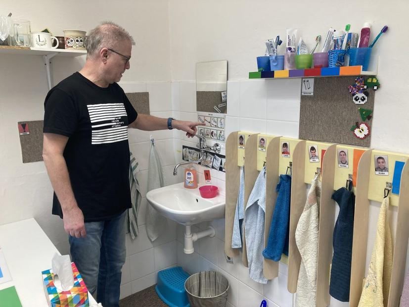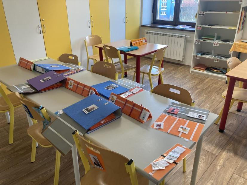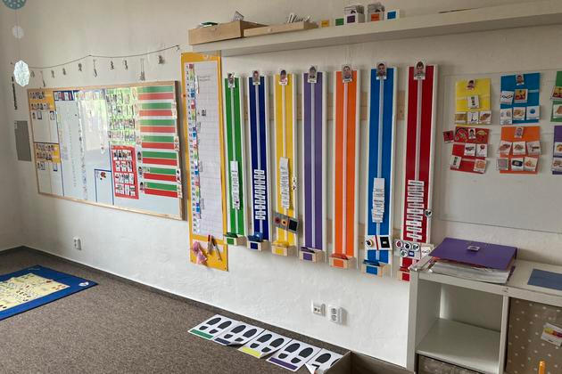 Vracíme se ještě do třídy, kde se pracuje s dětmi, které nemají úplně nejtěžší formu autismu. Čeká na nás prázdná třída, děti jsou zrovna na obědě v hlavní jídelně. „Nevadí,“ říká Musil, „alespoň si můžeme detailněji prohlédnout, s čím tu žáci pracují.“