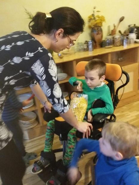 Přesto by to nešlo bez obrovské vůle na všech stranách. Tak například potřeboval Péťa vyšší stůl, aby pod něj mohl zajet s vozíkem. „Mohl by sedět někde vedle, ale učitelky měly pocit, že by měl být co nejvíc s dětmi. A já jsem byla ráda, že to vidí stejně jako já,“ říká Monika Kašparová. Nejdřív se na nový stůl snažila sehnat peníze, nakonec ho vyrobil jeden z tatínků ze školky. Přebalovací pult, který stojí v šatně, zvládl Péťův děda.