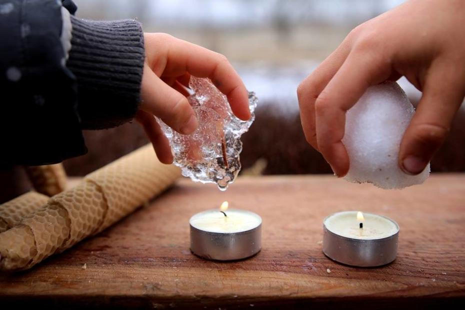 Jednoduchý pokus se sněhovou koulí a kusem ledu: dejte oboje nad svíčku – jak je možné, že ze sněhu neteče žádná voda, kdežto led silně odkapává a neustále zhasíná svíčku? Že jste to vy, tak vám to prozradíme, ale až to budete zkoušet s dětmi, nechte je, ať nejdřív přijdou s vlastními hypotézami. Věc se má tak, že sněhové vločky vytváří kolem sebe ve sněhu mnoho prostoru, proto začne kapat dříve led, který žádné takové prostory pro vázání rozpuštěné vody nemá.