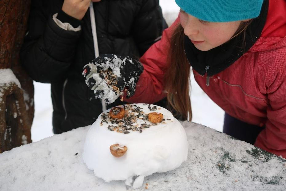 Vyšlapejte do sněhu vánoční stromek a ozdobte ho dobrotami pro zvířátka. Nebo ptáčkům vyrobte dort – stačí nacpat sníh do vhodné nádoby, pak ho vyklopit a ozdobit dobrotami pro malé opeřence.