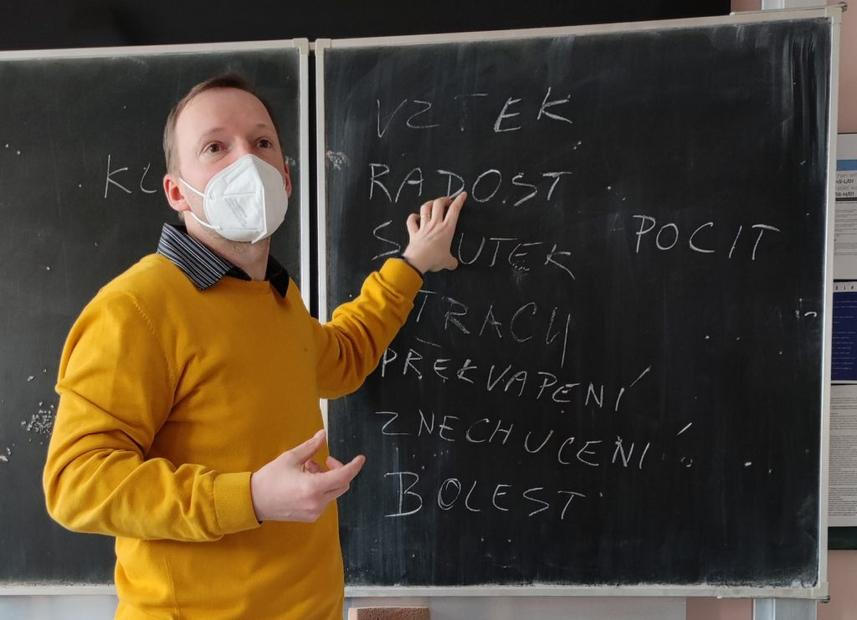 Na tabuli za ředitelem Jíšou přibývají křídou napsaná slova. „City, pocity, projevy, emoce, nálady – dost se nám to teď překrývá, pojďme si v tom udělat pořádek,“ navrhuje ředitel a připomíná klukům ze zadních lavic, že je ještě stále moderátorem diskuse. Ubíhají minuty a třída patnáctiletých puberťáků s naprostou vážností řeší, zda „dobrý pocit“ z něčeho nutně vede k tomu, že se člověku zlepší nálada. „Postavím psí boudu, kouknu na ni, mám z ní dobrý pocit, zlepší se mi nálada,“ nadhazuje jeden. „Potřebuju někomu něco říct, řeknu mu to, z toho mám dobrý pocit, on ale reaguje divně a mně to náladu zhorší,“ kontruje druhý. Téma nálad tak považují za vyčerpané a přecházejí na příklady kuchařských výrobků.