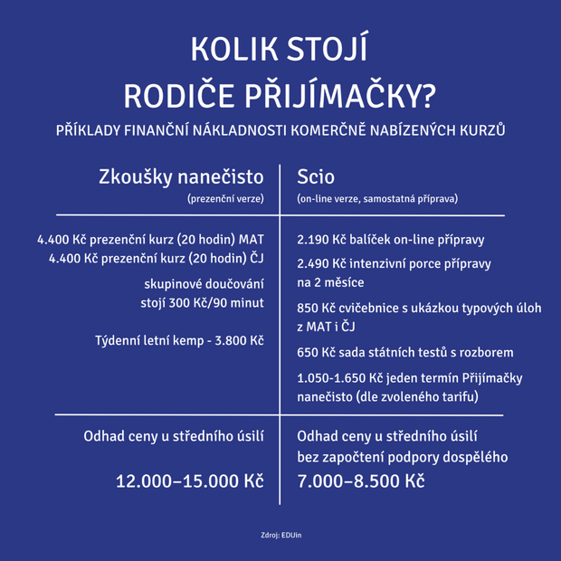 Jelikož mnozí rodiče se na výuku svých vlastních dětí z mnoha důvodů necítí, raději je svěřují do péče odborníků. Pro různé agentury i soukromé doučovatele představují právě testy Cermatu poměrně podstatný zdroj příjmů. Pokud se rodiče rozhodnou dítě posílat na skupinové kurzy organizované například společností Scio, které se odehrávají prezenčně ve větších městech nebo online z domova, zaplatí v základní variantě zhruba pět tisíc korun. Další tisícovky pak naskáčou za přijímačky nanečisto (600 korun za jedno testování), případně za takzvaný bootcamp neboli intenzivní "nalejvárnu“ o víkendu před zkouškami, která vyjde u Scio na 2.190 korun. „V případě, že chce žák mít lektora ´jen pro sebe´ a tedy platit si individuální přípravu, jsou ceny pochopitelně násobně vyšší, v řádu stokorun za odučenou hodinu,“ říká mluvčí společnosti Scio Bohuslav Bohuněk. Přípravku na přijímací zkoušky pořádá například i agentura Tutor, a to buď prezenčně v Praze a Chrášťanech, nebo odkudkoliv online. Pokud se dítě začne připravovat už od září, zaplatí rodiče 11.500 korun, pokud až od ledna, je to o tři tisíce méně. „Součástí těchto kurzů jsou tři kola testování,“ dodává za Tutor Aneta Sedláková.