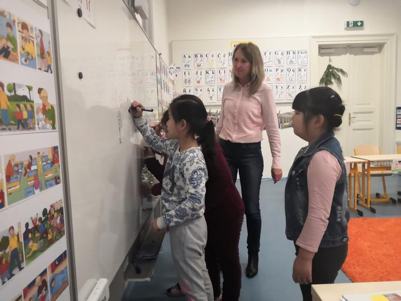 „Musím říct, že učit v této třídě je naplňující, ale nesmírně náročné. Pořád táhnu děti svou energií, neustále mluvím, hlídám si pečlivě výslovnost,“ říká Lenka Kader Aghová, která v integrační třídě vyučuje dvě hodiny denně a jinak je třídní třeťáků. Jejím cílem je, aby děti po čtvrt roce uměly základy: poprosit, poděkovat, a znaly „školní“ slovní zásobu – podepiš, nakresli, vystřihni. Navíc se snaží s nimi procvičovat i matematiku, protože zatímco se malí cizinci učí česky, jejich kmenové třídy jdou dopředu v psaní a počítání. Proto také učitelka ke konci druhé hodiny zařazuje pohybovou hru na geometrické útvary. Když si udýchané děti sedají ke svačině, vytvoří tři černovlasé holčičky kroužek a začnou štěbetat vietnamsky. „Holky, třesky plesky, hezky česky,“ napomíná je Lenka, děvčata si jazykovou hříčku hned zkoušejí a smějí se, až se zalykají.