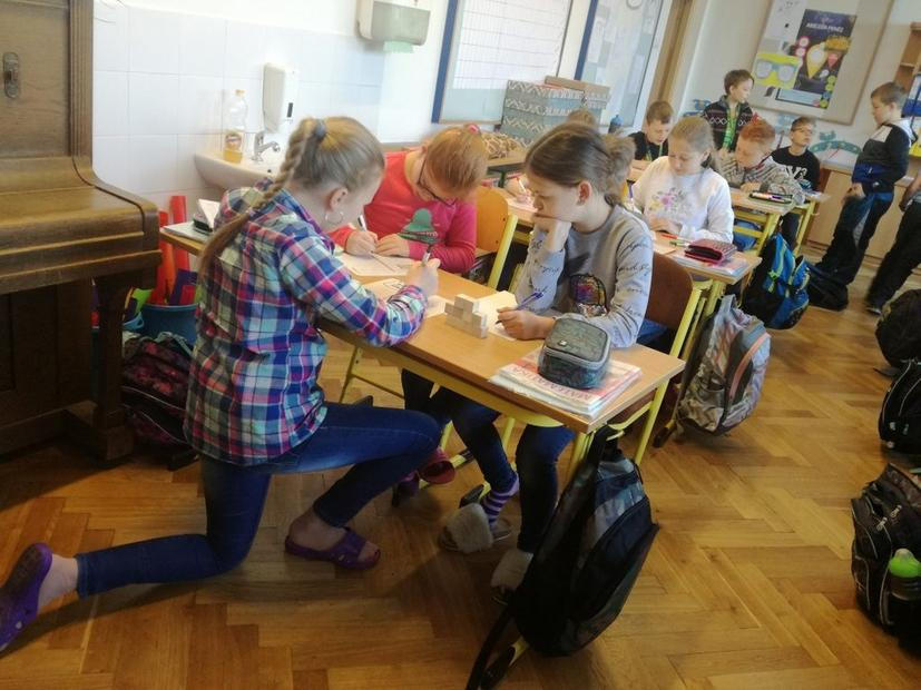 „Děti se k sobě chovají navzájem velmi slušně a partnersky. Jsou zvyklé si navzájem dávat zpětné vazby, ale ohleduplně, neagresivně. Jsou naučené říct – s tím nesouhlasím, vidím to jinak, ale nikdo se nikomu nevysmívá. Myslím, že se mi vrací zpátky energie, kterou do této třídy už čtvrtým rokem dávám,“ hodnotí argumentaci svých žáků spokojeně. Mezitím píše na tabuli řadu čísel – sudých, lichých, včetně prvočísel. Děti se rozdělují do trojic a ověřují, „kolikaobdélníkové“ je které číslo. Píšou na tabulky násobky, vytvářejí obdélníky. Kateřina prochází mezi lavicemi, nahlíží dětem přes rameno, konzultuje.
