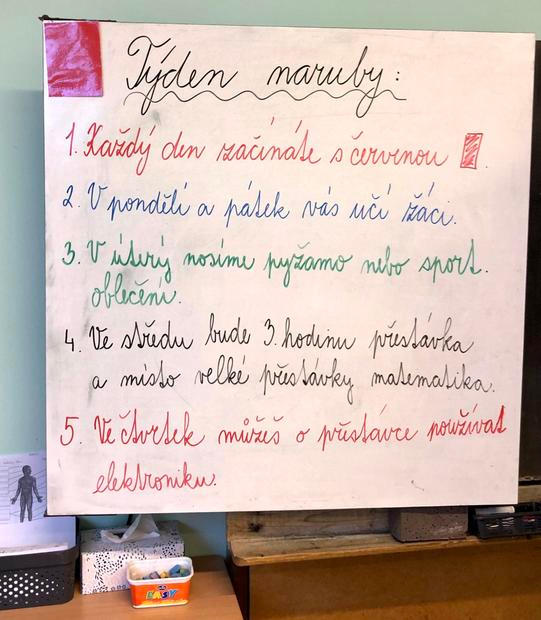 Během Týdne naruby se ale určitě všichni naučili víc než to, kde se píše měkké a kde tvrdé i/y. „Školní parlament po dvou letech připravil společně akci pro celou školu, pomáhali vymýšlet plakát, natočili upoutávku do rozhlasu,“ chválí Marie Pojerová. A děti z celé školy dost možná pochopily, že připravit se na výuku nebo zkrotit třídu není legrace.