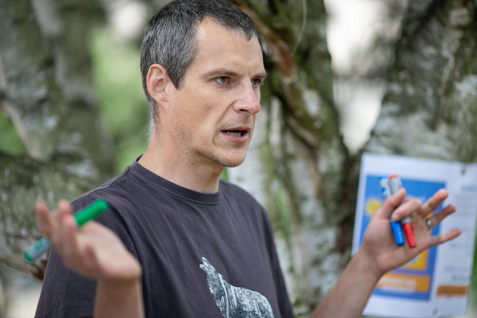 Přicházíme na školní zahradu a učitelka Petra Slámová mi ukazuje stanoviště, kde se žáky budu dnes debatovat. Škola na dopoledne naplánovala celkem čtyři dobrovolníky, kteří budou vyprávět o svých profesích. A žáci si pro každý ze dvou bloků vybrali toho člověka (a tím i jeho profesi), který je zajímá. „Při výběru dobrovolníků jsme tentokrát volili ‚občankářská´ témata. Zamysleli jsme se nad tím, co děti v určitém věku provází,” říká učitelka občanské výchovy Petra Slámová, která celý den organizuje. Nakonec vybrala téma výživy (protože s poruchami příjmu potravy se děti potkávají), téma energetiky – odolnosti (protože škola je zapojena do projektu o udržitelnosti), téma dobrovolnictví (protože v průběhu roku se děti setkávají s různými charitativními akcemi a sbírkami) a téma novinařiny (vzhledem k tomu, jak je dnes důležité odolávat fake news, dezinformacím).