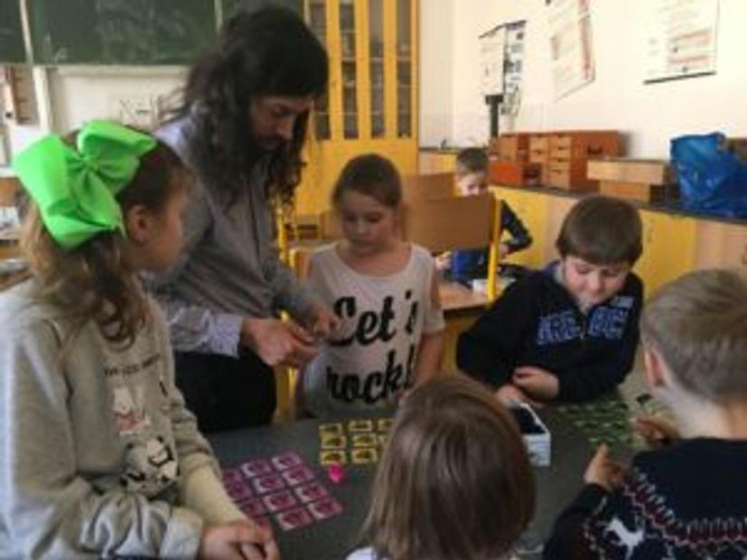 Děti se rozdělí na pár chumlíků kolem různých her. Některé si něco dělají samy. Jsou tu i tři holky, ale většina je kluků. První hra je na paměť, něco jako pexeso. Děti mají dvanáct karet, ty si musí chvilku zapamatovávat a pak je obrátí „lícem“ na lavici. Jeden klučík je s tím brzo hotový: už to mám! Pan učitel nabádá k větší důkladnosti: „To že si to pamatuješ teď, neznamená, že si to budeš pamatovat i za chvíli“. Doprostřed stolu se položí jedna karta a kdo z dětí si myslí, že ví, kde stejná karta leží u něj, rychle plácne na středovou kartu rukou. A pak všechny děti odkryjí u sebe kartu, o které se domnívají, že to je ta pravá. Body jsou za rychlost – za pořadí, plus správnost. Jako odměna se rozdávají zlaťáky.
