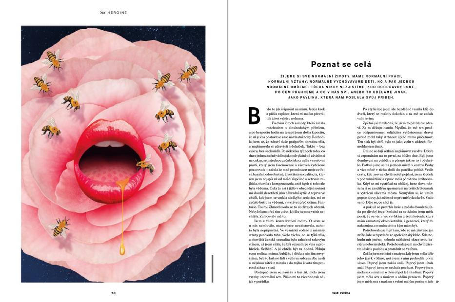 Kamarádka mi po přečtení tohohle čísla poslala zprávu: „Jsem ráda, že dnes už o tom všem můžeme normálně mluvit. Kéž bych si tuhle Heroine mohla přečíst před patnácti lety, když jsem se sexem začínala a byla jsem plná komplexů. Myslím, že ty články mě dojímají proto, že některá ta zranění si léčím dosud.“