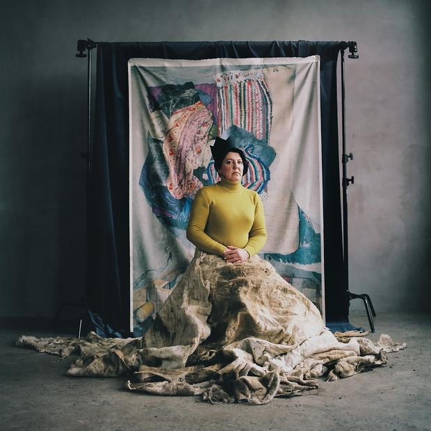 Obraz na pozadí, který je vytištěný na látku, byl zachycen ukrajinskou umělkyní SpasiSohrani během prvních válečných dní, když utíkala z Ukrajiny.