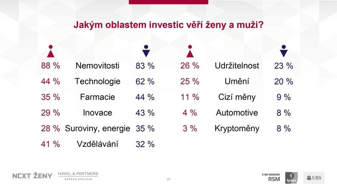 Pokud jde o oblasti investic, tak po vynechání bankovních produktů typu spořicích účtů, termínovaných vkladů či spoření na důchod převažují u obou pohlaví nemovitosti. Plných 85 % lidí je označila za oblast, které investičně věří. Aktuálně využívá nemovitost jako investici 75 % mužů a o 17procentních bodů méně žen. Do budoucna by se ale jejich počet měl zvýšit; třetina žen v průzkumu uvedla, že chce do nemovitostí investovat v budoucnu.
