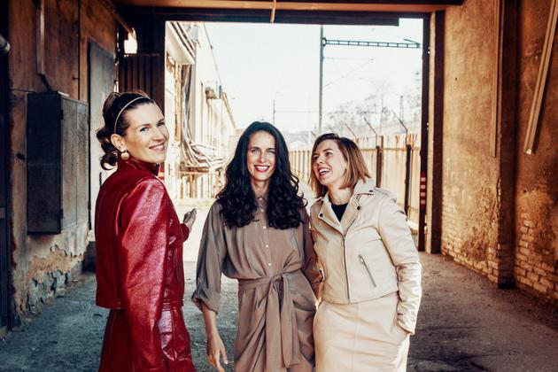Bára Bühnová má na sobě červenou přechodnou bundu (2099 Kč) a sukni (1399 Kč), Dita Formánková hnědé šaty (2599 Kč), Monika Ptáčníková světlou bundu ramoneska (4699 Kč) a béžovou sukni (3899 Kč), vše z kolekce Answear.LAB Sisterhood Treasure. Foto: Ondřej Košík. Make-up a styling: Natálie Host (Pure District). Produkce: Linda Majerová
